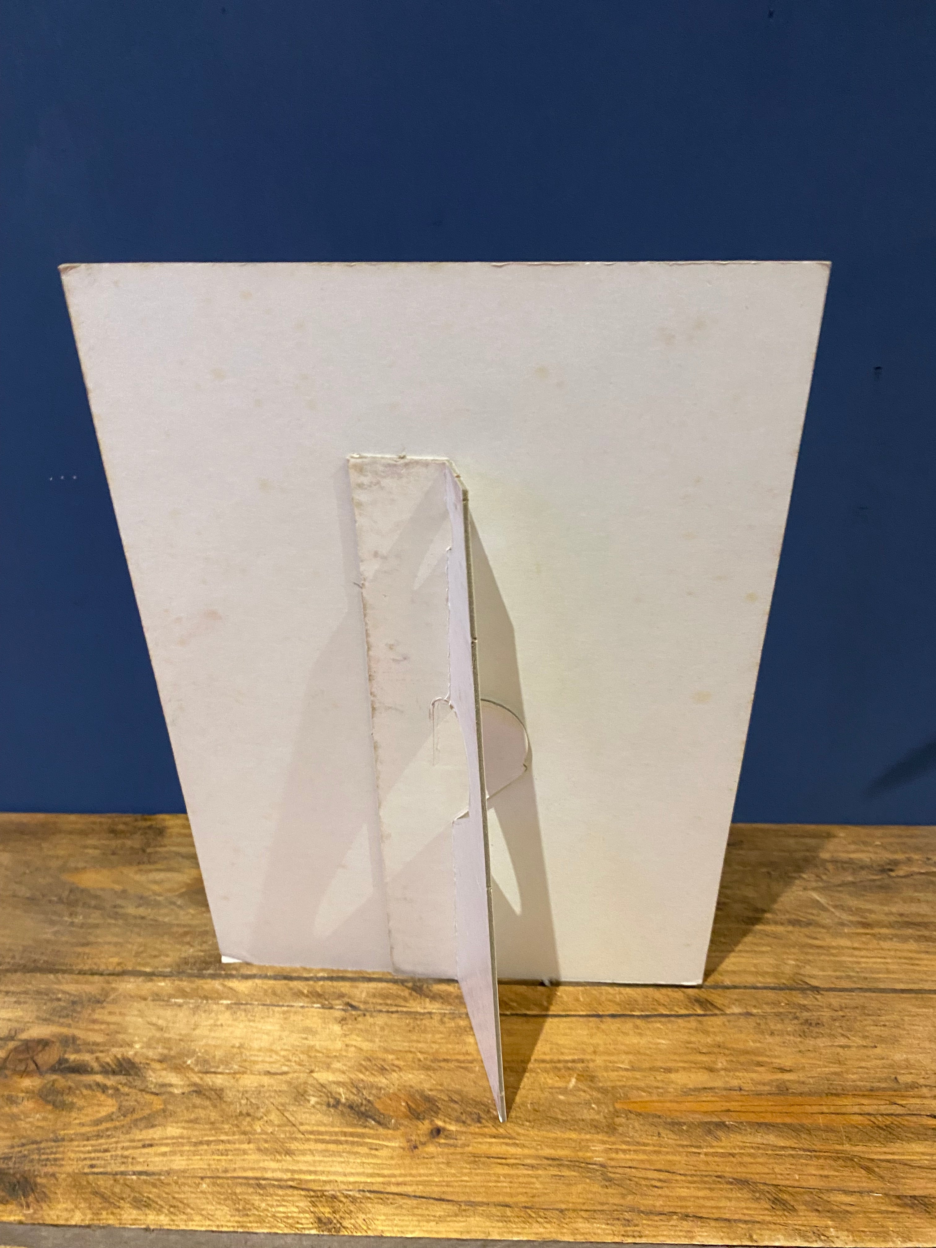 .This is a showcard which would have been on a store counter of a record shop promoting an upcoming single or album .